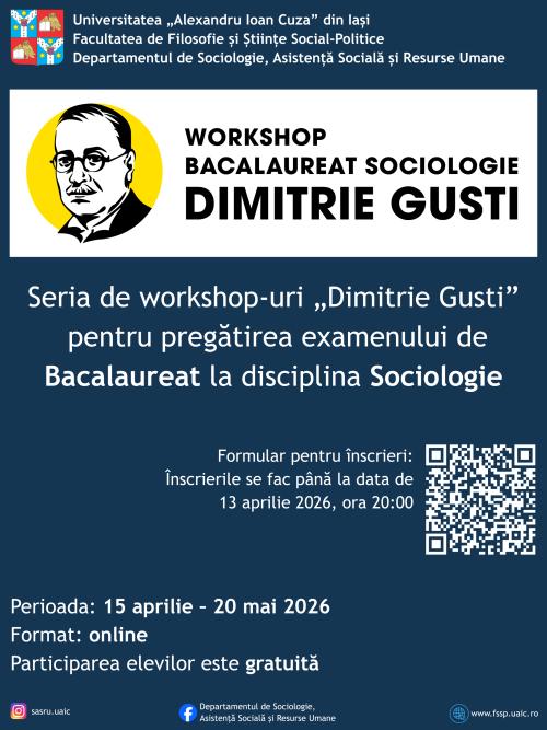 În perioada 15 aprilie – 20 mai 2026, Departamentul de Sociologie, Asistență Socială și Resurse Umane, din cadrul Facultății de Filosofie și Științe Social-Politice, Universitatea „Alexandru Ioan Cuza” din Iași organizează, în format online, Seria de workshop-uri „Dimitrie Gusti” pentru pregătirea examenului de Bacalaureat la disciplina Sociologie – Ediția a III-a. La primele două ediții, organizată în 2024 și 2025, au participat 154 de elevi, proveniți din 27 de județe.